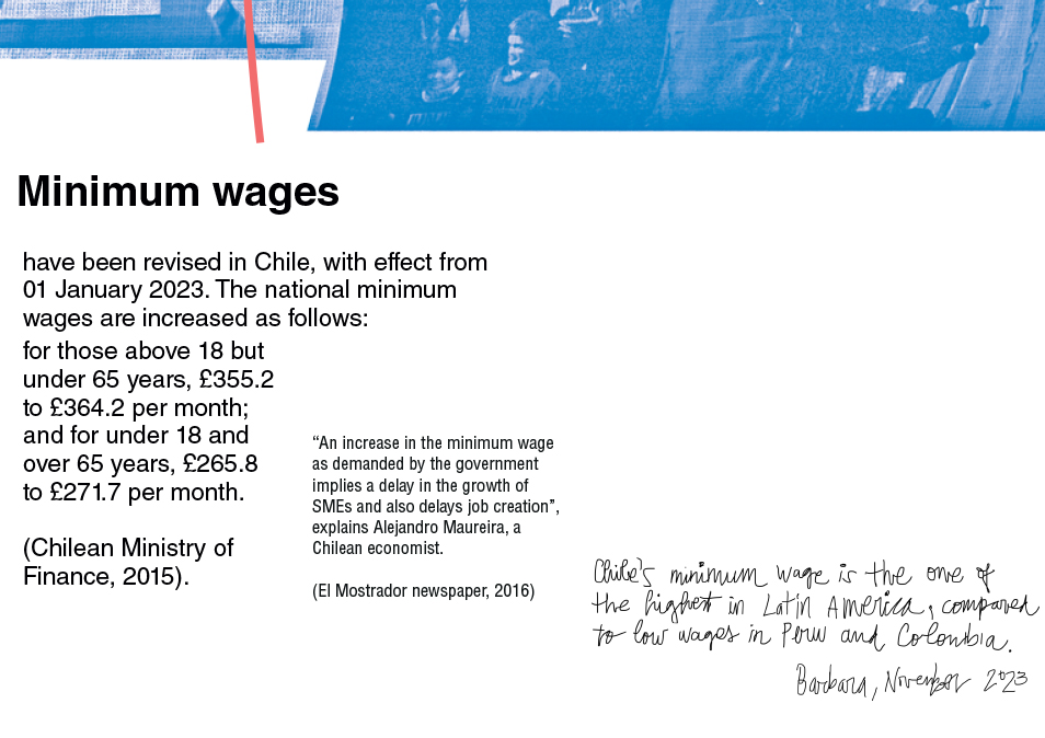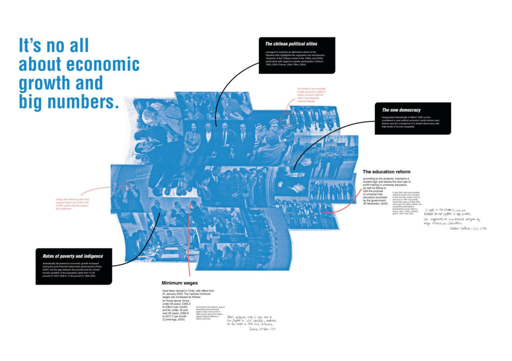 The use of annotation in this exercise is deployed as a critical artefact to highlight and expose the high levels of inequality in Chile along with all its associated conflicts. An annotation system was used in order to explore Kitchin’s (2016) categorisation of data sources and some visual principles of Drucker’s (2013) diagrammatic writing. The different data sources were examined through an official narrative of a social crisis provided by the government, an official narrative by media journalists, and a personal Twitter account (or X) of the same crisis from someone who experienced it first-hand. Textual arrangements were explored based on the primary aspects of diagrammatic writing, such as placement and relationship to other elements, as well as attributes such as framing.